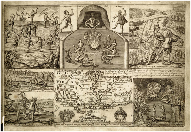 Cette photo est tirée du livre "The Generall Historie of Virginia" écrit en 1624. Elle fut desinée par John Smith et illustre les voyages de celui-ci lors des ses exploration de la Virginie. Le livre ce trouve aujourd'hui au British Museum à Londres.