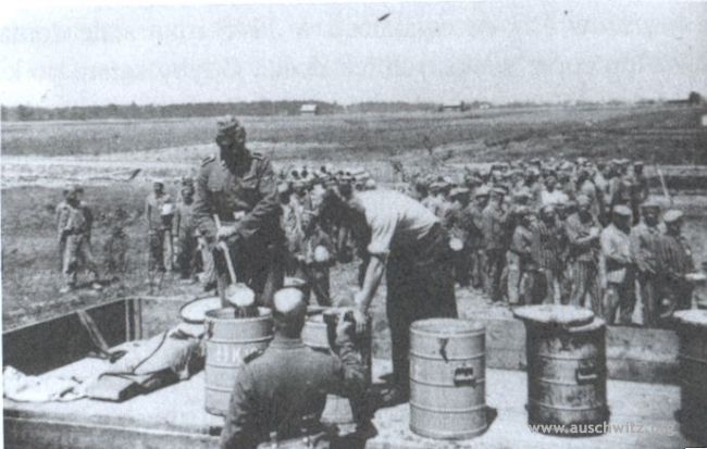 Legend: Prisoners queuing for their daily soup ration. Auschwitz-Birkenau State Museum Archives www.auschwitz.org