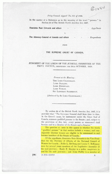 Of the Appellants, Henrietta Muir Edwards is the vice-president for the Province of Alberta of the National Council of Women for Canada; Nellie L. McClung and Louise C. McKinney were for several years members of the Legislative Assembly of said province; Emily F. Murphy is a police magistrate in and of the said province; and Irene Parlby is a member of the Legislative Assembly of the said province and a member of …