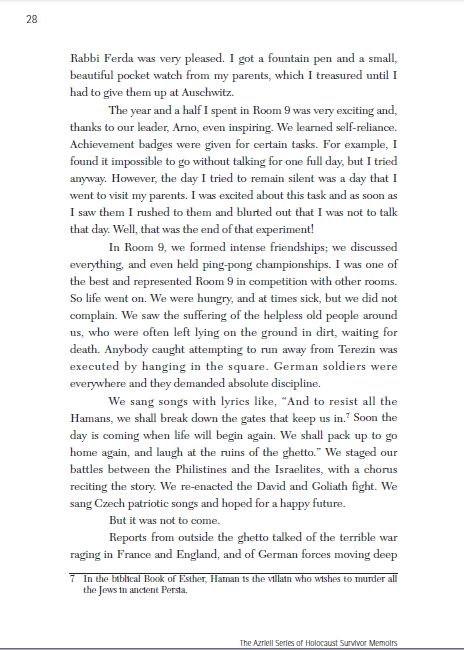 I memorized the whole portion and Rabbi Ferda was very pleased. I got a fountain pen and a small, beautiful pocket watch from my parents, which I treasured until I had to give them up at Auschwitz.The year and a half I spent in Room 9 was very exciting and, thanks to our leader, Arno, even inspiring. We learned self-reliance. Achievement badges were given for certain tasks. For example, I found it impossible to go without talking for one full day, but I tried anyway. However, the day I tried to remain silent was a day that Iwent to visit my parents. I was excited about this task and as soon as I saw them I rushed to them and blurted out that I was not to talk that day. Well, that was the end of that experiment! In Room 9, we formed intense friendships; we discussed everything, and even held ping-pong championships. I was one of the best and represented Room 9 in competition with other rooms. So life went on. We were hungry, and at times sick, but we did not complain. We saw the suffering of the helpless old people around us, who were often left lying on the ground in dirt, waiting fordeath. Anybody caught attempting to run away from Terezin was executed by hanging in the square. German soldiers were everywhere and they demanded absolute discipline.We sang songs with lyrics like, “And to resist all the Hamans, we shall break down the gates that keep us in. Soon theday is coming when life will begin again. We shall pack up to go home again, and laugh at the ruins of the ghetto.” We staged our battles between the Philistines and the Israelites, with a chorus reciting the story. We re-enacted the David and Goliath fight. We sang Czech patriotic songs and hoped for a happy future.But it was not to come.