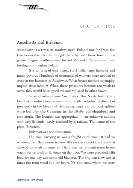 Auschwitz is a town in southwestern Poland not far from the Czechoslovakian border. To get there by train from Terezin, one passes Prague, continues east toward Moravska Ostrava and then, turning north, enters Poland.It is an area of coal mines, steel mills, large factories and much poverty. Hundreds of thousands of workers were needed towork in the factories in Auschwitz. What better method to employunpaid slave labour? When these prisoners became too weak towork, they would be shipped out and replaced by other slaves.Several miles from Auschwitz, the Nazis built theirtwentieth-century horror invention: death factories. Unheard ofpreviously in the history of civilization, mass murder contraptionswere built by the Germans in the 1940s: gas chambers andcrematoria. The location was appropriate — an unknown addresswith vast flatlands, easily reached by a railway. The name of theplace: Birkenau.Birkenau was our destination. The train carrying us was a freight cattle train. It had no windows, but there were narrow slits on the side of the train that allowed some air to come in. There was just enough room in our wagon for us to sit or lie down on the floor. We were provided with food for one day and some old blankets. The trip was slow and at times the train stood still for hours.