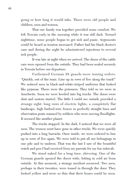 No one knew where we were going or how long it would take. There were old people and children, men and women. That our family was together provided some comfort. We left Terezin early in the morning while it was still dark. Toward nighttime, some people began to get sick and panic. Arguments could be heard as tension increased. Father had his black doctor’s case and during the night he administered injections to several sick people. It was late at night when we arrived. The doors of the cattle cars were opened from the outside. They had been sealed securely in Terezin before our departure. Uniformed German SS guards were issuing orders: “Quickly, out of the train. Line up in rows of five along the track!” We noticed men in black-and-white-striped uniforms that looked like pyjamas. These were the prisoners. They told us we were in Auschwitz. Soon we were herded into big trucks. The doors were shut and motors started. The little I could see outside provided a strange sight: long rows of electric lights, a completely flat landscape, high barbed-wire fences in perfectly straight lines and observation posts manned by soldiers who were moving floodlights. It seemed like another planet. The trucks stopped. In the dark, I noticed that we were all men. The women must have gone in other trucks. We were quickly pushed into a long barracks. Once inside, we were ordered to lineup in rows of five again. We were told to put all our belongings in one pile and to undress. That was the last I saw of the beautiful watch and pen I had received from my parents for my bar mitzvah. We stood naked for a long time, shivering. One of the German guards opened the doors wide, letting in cold air from outside. At this moment, a strange incident occurred. Two men, perhaps in their twenties, were tossed in through the door. They looked yellow and were so thin that their bones could be seen.