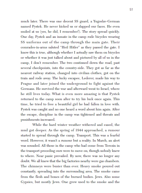 This was a miracle and we found out the full story only much later. There was one decent SS guard, a Yugoslav-German named Pystek. He never kicked us or slapped our faces. He even smiled at us (yes, he did, I remember!). The story spread quickly. One day, Pystek and an inmate in the camp rode bicycles wearing SS uniforms out of the camp through the main gate. Their comrades-in-arms saluted “Heil Hitler” as they passed the gate. I know this is true, although whether I actually saw them on bicycles or whether it was just talked about and pictured by all of us in the camp, I don’t remember. The two continued down the road, past several checkpoints, into the country-side. They got as far as the nearest railway station, changed into civilian clothes, got on the train and rode away. The lucky escapee, Lederer, made his way to Prague and later joined the underground to fight against the Germans. He survived the war and afterward went to Israel, where he still lives today. What is even more amazing is that Pystek returned to the camp soon after to try his luck once again. This time, he tried to free a beautiful girl he had fallen in love with. Pystek was caught and no one heard a word about him again. Afterthe escape, discipline in the camp was tightened and threats and punishments increased. While the hard winter weather withered and eased, the mud got deeper. As the spring of 1944 approached, a rumour started to spread through the camp. Transport. This was a fearful word. However, it wasn’t a rumour but a reality. In March, an alert was sounded. All those in the camp who had come from Terezin in the transport preceding ours were to move on, though nobody knew to where. Near panic prevailed. By now, there was no longer any doubt. We all knew that the big factories nearby were gas chambers.The chimneys were busier than ever. Heavy smoke poured out constantly, spreading into the surrounding area. The smoke came from the flesh and bones of the burned bodies. Jews. Also some Gypsies, but mostly Jews.