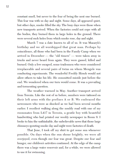 One grew used to the smoke and the constant smell, but never to the fear of being the next one burned.This fear was with us day and night. Some days, all appeared quiet, but other days, smoke filled the sky. The busy days were those when new transports arrived. When the factories could not cope with all the bodies, they burned them in large holes in the ground. There were several such holes from which smoke rose, day and night. March 7 was a date known to all of us. It was Masaryk’s birthday and we all worshipped that great man. Perhaps by coincidence, all those who had been in the Family Camp when we arrived in December — the “old timers” — were taken away in trucks and never heard from again. They were gassed, killed and burned. Only a few escaped, some tradesmen who were considered irreplaceable and several pairs of twins on whom Mengele was conducting experiments. The wonderful Freddy Hirsch would not allow others to take his life. He committed suicide just before the end. We wondered when our turn would come. It was a prevailing and tormenting question.The weather warmed in May. Another transport arrived from Terezin. Like the rest of us before, numbers were tattooed on their left arms with the prefixes A or B. We embraced the newcomers who were as shocked as we had been several months earlier. I recollect walking along the muddy road with one of my roommates from L417 in Terezin, a gentle boy with beautiful handwriting who had printed our weekly newspaper in Room 9. I broke to him the unthinkable, the unbelievable news that those large chimneys spouting smoke day and night were factories of death. That June, I took off my shirt to get some sun whenever possible. On days when the sun shone brightly, we were all overjoyed, even though our fear was great. Despite our fear and hunger, our children’s activities continued. At the edge of the camp there was a large water reservoir and, for a while, we were allowed to use it for swimming.