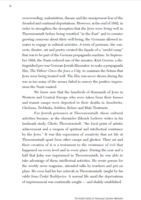 For Jewish prisoners at Theresienstadt, these cultural activities became, as the chronicler Zdenek Lederer writes in his landmark study, Ghetto Theresienstadt, “the focal point of artistic achievement and a weapon of spiritual and intellectual resistance by the Jews.” It was this expression of creativity that set life at Theresienstadt apart from other camps and ghettos. Their art and their creation of it is a testament to the resistance of evil that happened on every level and in every place. During the year and a half that John was imprisoned in Theresienstadt, he was able to take advantage of these intellectual activities. He wrote poems for the weekly news magazine, attended talks by teachers and put on plays. He even had his bar mitzvah in Theresienstadt, taught by his rabbi from Cˇ eské Budeˇjovice. A normal life amid the deprivations of imprisonment was continually sought — and shakily established.